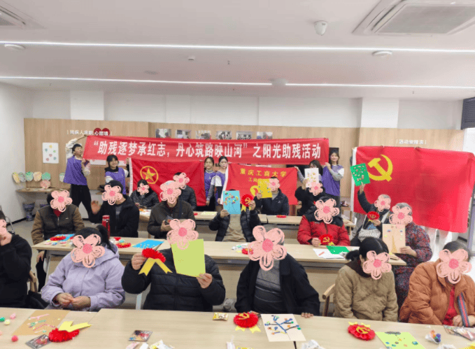 2025年12月19日,重庆工商大学工商管理学院分团委第六届“爱心桥”青年志愿者服务队、重庆工商大学工商管理学院心理工作站、学生三支部党员走进重庆市两江新区华新街道华联社区“渝馨家园”举办了主题为“红色领航,心向阳光”的心理健康关爱活动。本次活动在世界反法西斯战争胜利80周年与世界残疾人日双重契机下,通过红色文化与心理关怀的融合互动,为残障朋友带来一场温暖而富有意义的冬日体验。