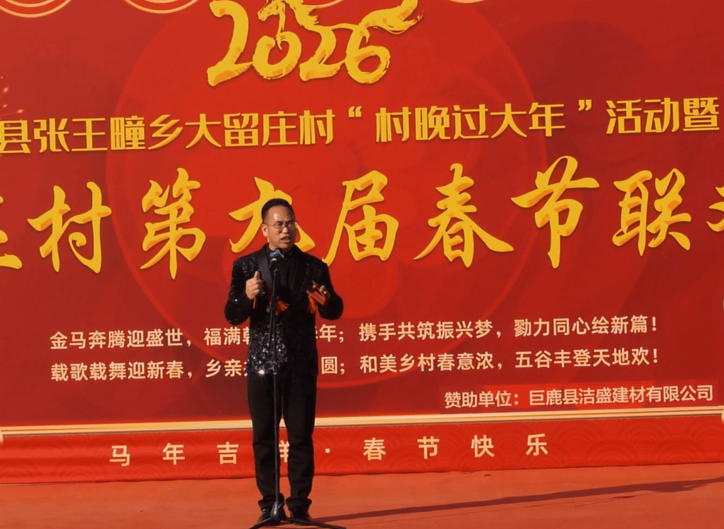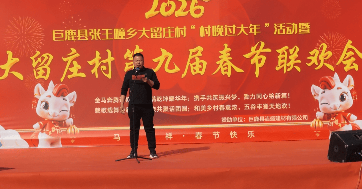 村新一届领导班子邢雷兵代表村“两委”上台发表新春贺词,他首先向全村父老乡亲及在外游子致以最诚挚的新春祝福,回顾了过去一年大留庄村在乡村振兴、民生改善、文化建设等方面取得的显著成就,展望了2026年的发展蓝图。他表示,新一届村“两委”将始终坚守为民初心,真抓实干、担当作为,带领全村群众共建宜居宜业和美大留庄,让群众的获得感、幸福感、安全感持续提升。贺词铿锵有力、振奋人心,赢得了台下阵阵掌声。