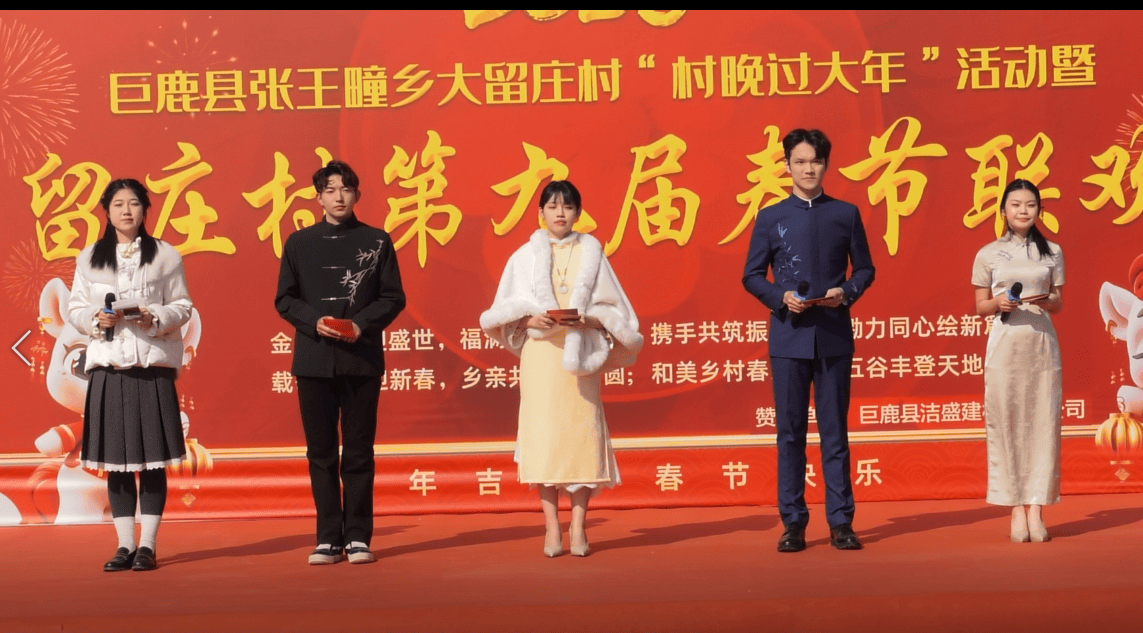 本届联欢会以“传承文脉新风尚,共筑和美大留庄”为主题,节目形式丰富多元、异彩纷呈,既有彰显时代气息的动感演绎,也有浸润传统文化的经典呈现,全方位展现了大留庄村群众昂扬向上的精神风貌和乡村文化建设的丰硕成果。虽然是村办联欢会,但是大留庄村每年的春节联欢会,主持阵容都是非常专业,他们都是来自专业院校,才华出众,令人赞叹!当五位靓丽的青年才俊一上台,那都会让人眼前一亮!