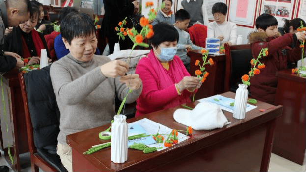 制作过程中,现场气氛轻松而专注。大家纷纷动手,精心缠绕、塑形,一朵朵栩栩如生的扭扭棒柿子花逐渐在指间绽放。居民们不时相互交流心得,切磋手法,遇到难点便主动请教老师或身旁伙伴。温馨互助的场景随处可见:动作娴熟的银龄居民主动放慢节奏,耐心指导身旁的未成年人;年轻人则帮助年长者整理材料、固定造型。这种跨越年龄的协作与分享,让活动现场格外温暖。