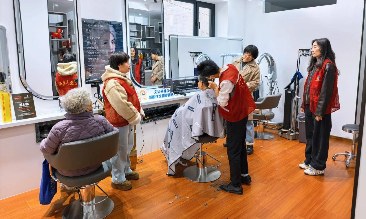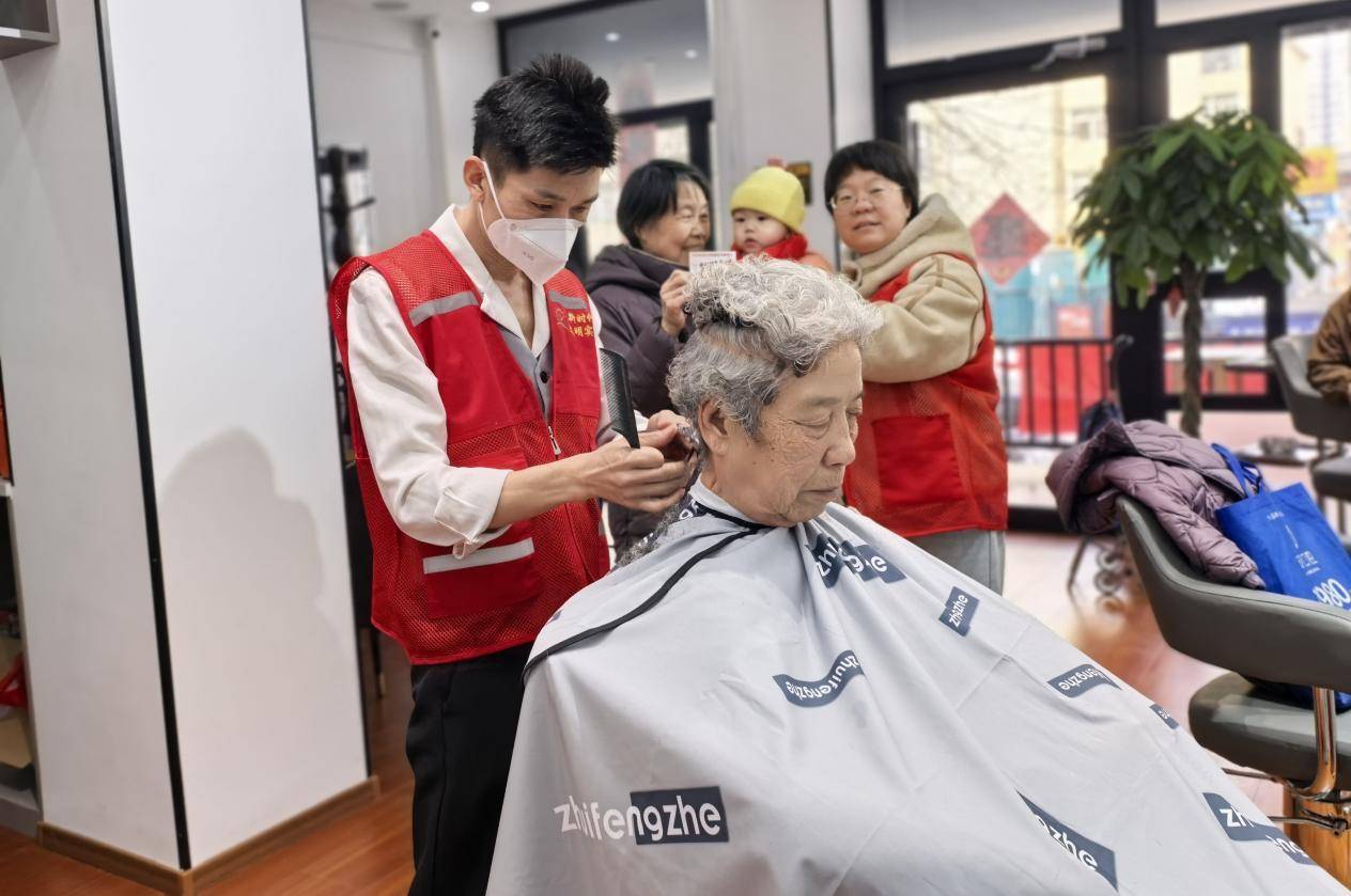 活动现场秩序井然、暖意融融。社区工作人员细心引导,理发师们技术娴熟、服务周到,认真为每一位老人修剪发型。大家一边理发一边唠家常,欢声笑语不断,现场氛围温馨和谐。